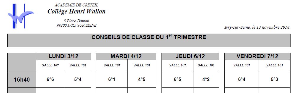 Conseils de classe du 1er trimestre Voici le calendrier des conseils de classe du 1er trimestre. La remise des bulletins aura lieu le jeudi 20 novembre 2018. Pour le télécharger, veuillez cliquer ici --> Conseils de classe 1er trimestre Images liées: