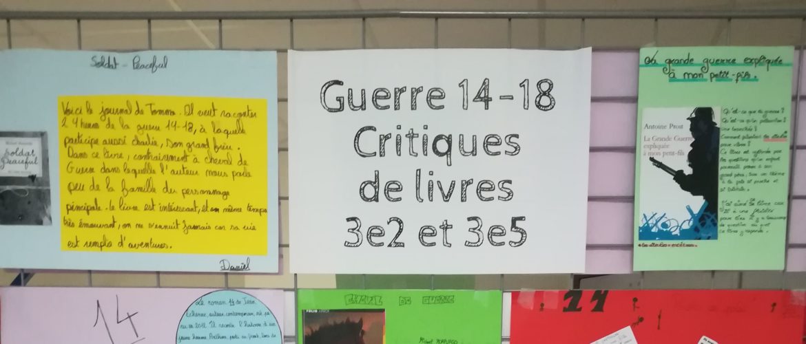Dans le cadre de leur cours de français, en collaboration avec Mme Lazzarini les élèves de 3°5 et 3°2 vous proposent des critiques de livres présents au CDI et traitant de la première guerre mondiale.