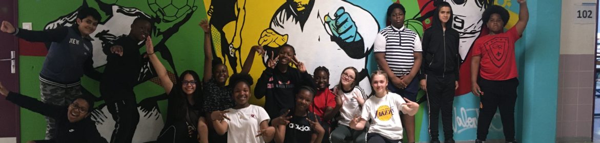 Après avoir bénéficié d'une découverte du graffiti et du street art autour du collège avec un intervenant spécialisé, les élèves ont eux-même réfléchis et choisis le thème de la fresque du collège. "L'égalité homme/femme dans le sport" a été retenu et l'idée de représenter deux sportifs et deux sportives français.e.s pour illustrer ce thème a germé.