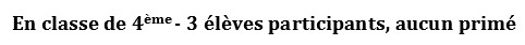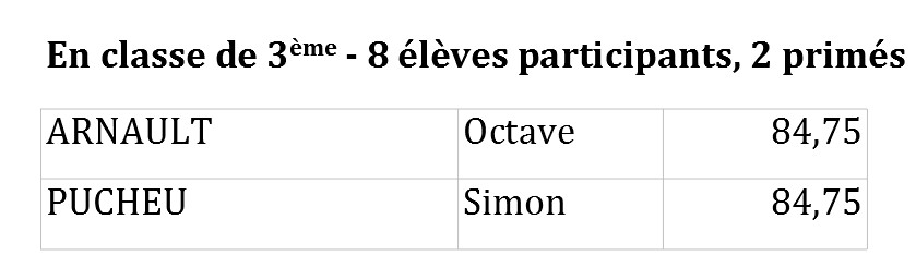 Tous les participants ont reçu ce mardi 21 mai un diplôme avec leur classement national ainsi qu’une règle d’or. Une quinzaine d’élèves ont réussi à se démarquer et ont été récompensé par des cadeaux supplémentaires : t-shirt du jeu-concours, jeux de logique et même un voyage à Blois pour une élève.